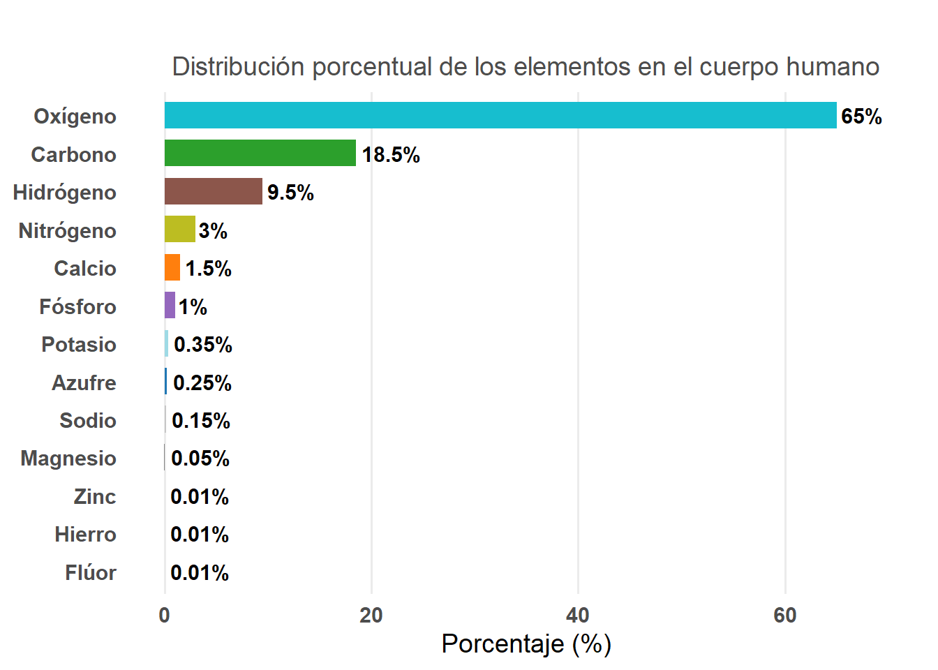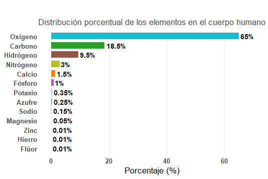 # ==========================================# Composición elemental del cuerpo humano# Gráfico de barras horizontales (didáctico)# ==========================================# Datos baseelementos<-c("Oxígeno", "Carbono", "Hidrógeno", "Nitrógeno", "Calcio","Fósforo", "Potasio", "Azufre", "Sodio", "Magnesio","Hierro", "Flúor", "Zinc")porcentaje<-c(65, 18.5, 9.5, 3.0, 1.5, 1.0, 0.35, 0.25, 0.15, 0.05, 0.01, 0.01, 0.01)# Crear el marco de datoselementos_df<-data.frame(Elemento =elementos, Porcentaje =porcentaje)# Libreríaslibrary(ggplot2)# Paleta de colores didácticapaleta<-c("#1f77b4", "#ff7f0e", "#2ca02c", "#d62728","#9467bd", "#8c564b", "#e377c2", "#7f7f7f","#bcbd22", "#17becf", "#9edae5", "#c7c7c7", "#ffbb78")# ==========================================# Gráfico de barras horizontales# ==========================================grafico_barras<-ggplot(elementos_df,aes(x =reorder(Elemento, Porcentaje), y =Porcentaje, fill =Elemento))+geom_col(width =0.7, show.legend =FALSE)+geom_text(aes(label =paste0(Porcentaje, "%")), hjust =-0.1, size =4, fontface ="bold")+coord_flip()+scale_fill_manual(values =paleta)+labs(title =" ", subtitle ="Distribución porcentual de los elementos en el cuerpo humano", x ="", y ="Porcentaje (%)")+theme_minimal(base_size =14)+theme(plot.title =element_text(face ="bold", hjust =0.5), plot.subtitle =element_text(hjust =0.5, color ="gray30"), axis.text =element_text(face ="bold"), axis.title.y =element_blank(), panel.grid.major.y =element_blank(), panel.grid.minor =element_blank())+ylim(0, 70)# ajusta el rango del eje Y# Mostrar el gráficoprint(grafico_barras)