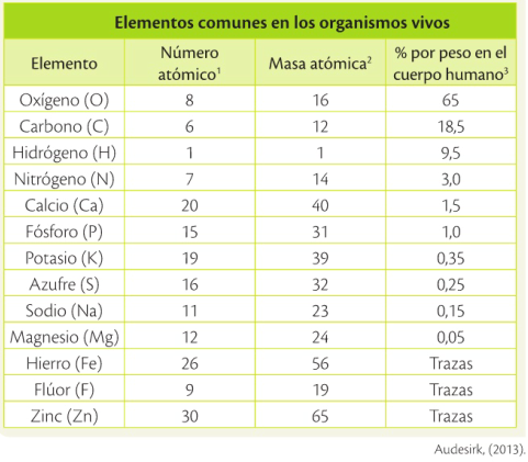 En la biosfera, casi todos los elementos aparecen en cantidades pequeñas y pocos son esenciales para la vida en el planeta. Los elementos más comunes de los seres vivos son cuatro: oxígeno, carbono, hidrógeno y nitrógeno, que suman alrededor de 96% del peso del cuerpo humano; en el resto de seres vivos, el porcentaje es similar. Estos y otros elementos que también existen en los organismos en cantidades muy pequeñas, son considerados bioelementos.
