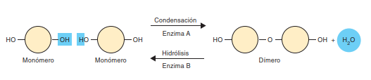 Los monómeros se unen entre sí para formar moléculas más grandes, llamadas polímeros. Esto ocurre como resultado de reacciones llamadas síntesis por deshidratación. En la deshidratación se pierde una molécula de agua (deshidratación = eliminación de agua).