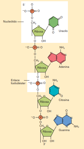 Los enlaces fosfodiéster se enlazan covalentemente el grupo OH del carbono 3 ’ de la pentosa del primer nucleótido y el grupo fosfato del carbono 5 ’ de la pentosa del siguiente nucleótido. En esta reacción se libera una molécula de agua y se forma un dinucleótido. La secuencia de nucleótidos constituye el ADN o ARN.