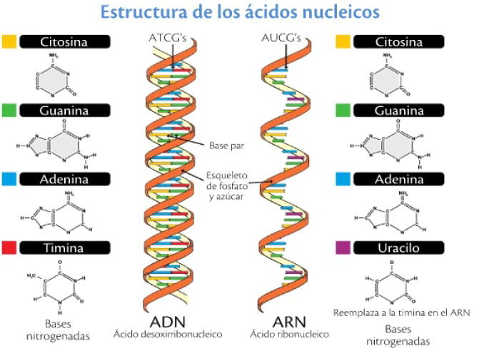 Adenina, timina, citosina, guanina en ADN. Adenina, uracilo, citosina y guanina en ARN.