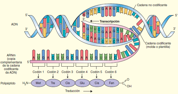 El ADN transmite la información al ARN mensajero; esto se llama transcripción. Con esta información, y gracias al ARN y a los ribosomas (ARN ), se hace posible la traducción del ARN a aminoácidos, los cuales van enlazándose para formar proteínas. Por tanto, la expresión del ADN se da en proteínas.