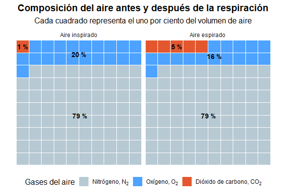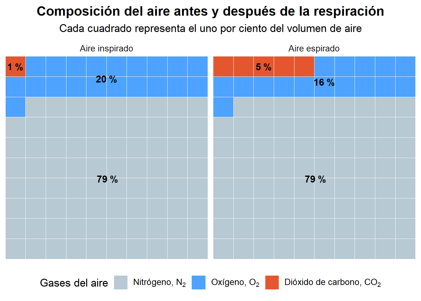 # -------------------------------# Aire inspirado# -------------------------------aire_inspirado<-data.frame( Unidad =1:100, Gas =c(rep("CO2", 1),rep("O2", 20),rep("N2", 79)), Estado ="Aire inspirado")# -------------------------------# Aire espirado# -------------------------------aire_espirado<-aire_inspirado%>%mutate( Gas =case_when(Unidad%in%1:5~"CO2",Unidad%in%6:21~"O2",TRUE~"N2"), Estado ="Aire espirado")# Unir datosdatos<-bind_rows(aire_inspirado, aire_espirado)# Orden lógico de lectura (paneles)datos$Estado<-factor(datos$Estado, levels =c("Aire inspirado", "Aire espirado"))# ORDEN QUÍMICO DE LOS GASES (clave)datos$Gas<-factor(datos$Gas, levels =c("N2", "O2", "CO2"))# Posiciones fijas (10 × 10)datos<-datos%>%mutate( x =(Unidad-1)%%10, y =10-((Unidad-1)%/%10))# -------------------------------# Etiquetas centradas por gas# -------------------------------etiquetas<-datos%>%group_by(Estado, Gas)%>%summarise( x =mean(x), y =mean(y), porcentaje =n(), .groups ="drop")%>%mutate( etiqueta =paste0(porcentaje, " %"))# -------------------------------# Gráfico# -------------------------------ggplot(datos, aes(x, y, fill =Gas))+geom_tile(color ="white")+geom_text( data =etiquetas,aes(x, y, label =etiqueta), inherit.aes =FALSE, size =4, fontface ="bold")+facet_wrap(~Estado, ncol =2)+coord_equal()+scale_x_continuous(expand =c(0, 0))+scale_y_continuous(expand =c(0, 0))+scale_fill_manual( values =c("N2"="#B7C9D3","O2"="#4DA3FF","CO2"="#E4572E"), labels =c(expression("Nitrógeno, "*N[2]),expression("Oxígeno, "*O[2]),expression("Dióxido de carbono, "*CO[2])))+labs( title ="Composición del aire antes y después de la respiración", subtitle ="Cada cuadrado representa el uno por ciento del volumen de aire", fill ="Gases del aire")+theme_minimal(base_size =13)+theme( plot.title =element_text(face ="bold", hjust =0.5), plot.subtitle =element_text(hjust =0.5), axis.title =element_blank(), axis.text =element_blank(), axis.ticks =element_blank(), panel.grid =element_blank(), legend.position ="bottom")