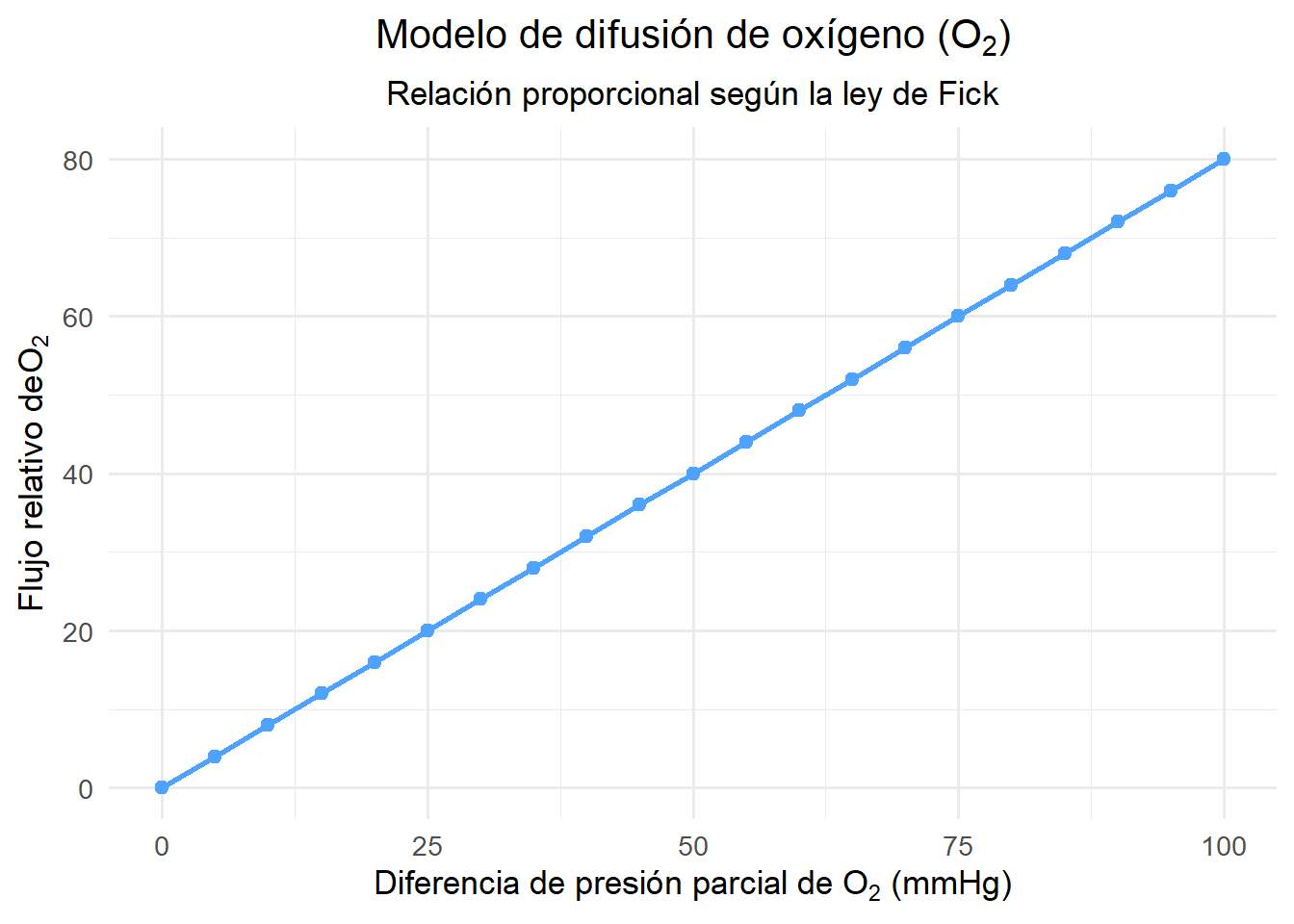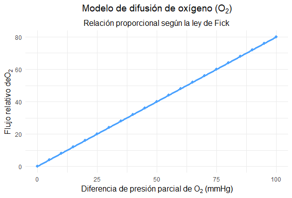 library(ggplot2)delta_p<-seq(0, 100, by =5)flujo<-delta_p*0.8datos<-data.frame( Diferencia_presion =delta_p, Flujo_O2 =flujo)ggplot(datos, aes(x =Diferencia_presion, y =Flujo_O2))+geom_line(linewidth =1.2, color ="#4DA3FF")+geom_point(size =2, color ="#4DA3FF")+labs( title =expression("Modelo de difusión de oxígeno ("*O[2]*")"), subtitle ="Relación proporcional según la ley de Fick", x =expression("Diferencia de presión parcial de "*O[2]*" (mmHg)"), y =expression("Flujo relativo de "*O[2]))+theme_minimal(base_size =13)+theme( plot.title =element_text(face ="bold", hjust =0.5), plot.subtitle =element_text(hjust =0.5))