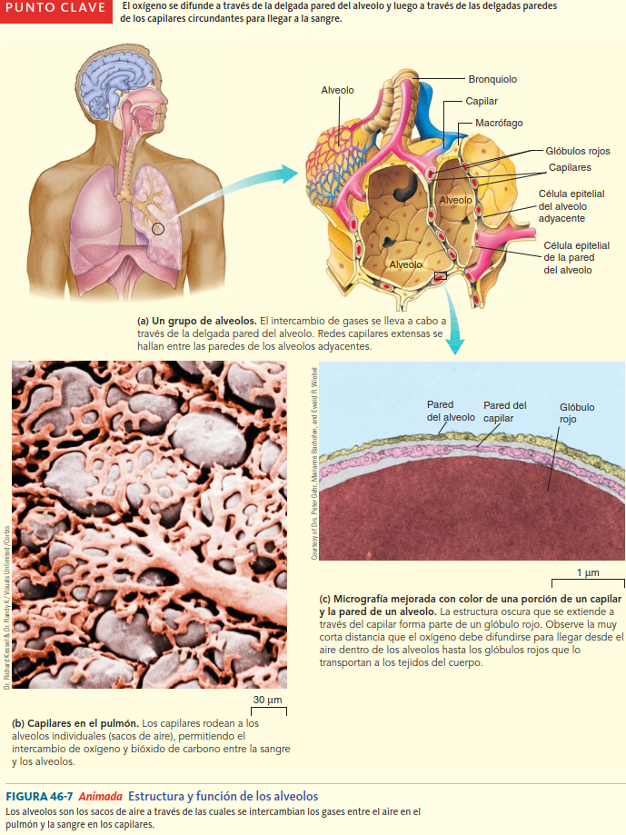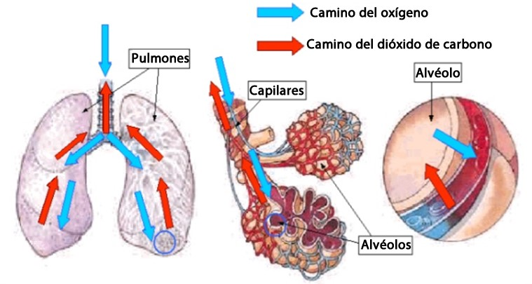 El intercambio gaseoso entre estos elementos obedece a ciertas leyes físicas como las de diferencia tensional de los gases, ley de difusión de los gases, entre otras. El oxígeno del aire a nivel de los alvéolos tiene mayor tensión que en la sangre venosa. Por otra parte, el anhídrido carbónico de la sangre venosa se encuentra a gran presión.