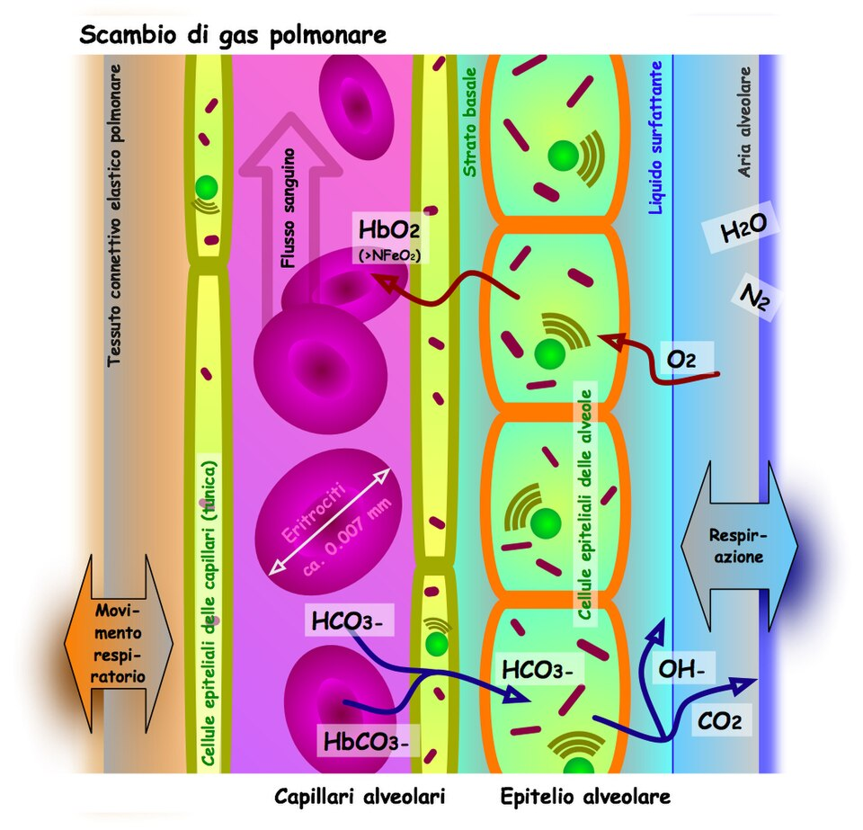 Estos dos elementos gaseosos están separados solo por las paredes endoteliales de los alvéolos y de los capilares, a través de los cuales se realizan fenómenos osmóticos, con el objeto de igualar las dos presiones; pasa el gas que se encuentra a mayor presión hacia el lugar de menor presión, así como el oxígeno del aire llega a la sangre y el anhídrido carbónico sale de ella. Lo anterior corresponde al fenómeno denominado hematosis pulmonar. Esto es posible debido a que los glóbulos rojos de la sangre poseen una sustancia, la hemoglobina, caracterizada por su avidez de oxígeno, debido al hierro que contiene. Al contacto con el oxígeno, la hemogoblina se transforma en un compuesto llamado oxihemoglobina, sustancia inestable que al ponerse en contacto con las células del endotelio capilar, cede su oxígeno y recibe el CO2 proveniente de la desasimilación celular, como residuo de las combustiones, y se transforma en carboxihemoglobina. Esto se manifiesta por el cambio en la coloración de la sangre: de roja viva se hace roja negruzca.