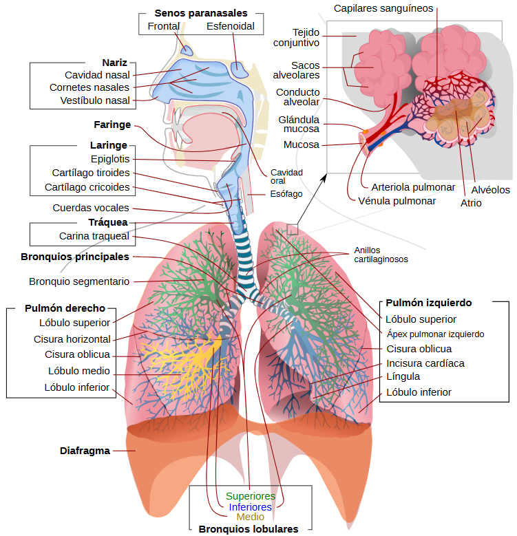 En el organismo humano, la respiración consta de dos partes: una encargada de llevar el oxígeno desde la atmósfera hasta los pulmones, y otra que consiste en el paso del oxígeno de los pulmones a la sangre y luego a los tejidos.