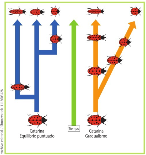 Esquema de la teoría del equilibrio puntuado. A partir de un organismo ancestral de un coleóptero (específicamente una mariquita) y pasando por tan solo dos organismos, se llega a tres especies diferentes. Esta transición sin demasiadas formas intermedias (como en la teoría gradualista) ocurre por “saltos evolutivos”.