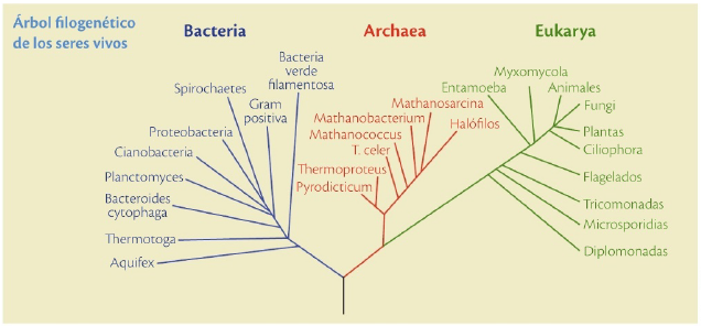 Con base en comparaciones genéticas, se llegó a determinar que el organismo más sencillo que comparte genes con el resto de seres vivos es una bacteria que vive en el fondo del océano, en las cercanías de las ventoleras hidrotermales (cerca de volcanes submarinos), en ausencias de oxígeno, donde la temperatura del agua es muy alta y se forman nubes gaseosas ricas en hidrógeno, CO y hierro, que son su alimento. Se nombró a este organismo como LUCA (siglas de last universal common ancestor ), pero eso no significa que sea el primer ser vivo del planeta. De hecho, el estadounidense Carl Woese (1928-2012) propuso la existencia de un llamado progenote, un ser incluso más sencillo que las actuales procariotas, que en lugar de ADN contaba con una sencilla molécula de ARN. A partir de su teoría, este científico diseñó el árbol filogenético del que se desprenden tres ramas. Las dos primeras corresponden a organismos procariotas (las bacterias y arqueas), y la tercera, a los eucariotas, desde los unicelulares protozoos a todos los multicelulares.