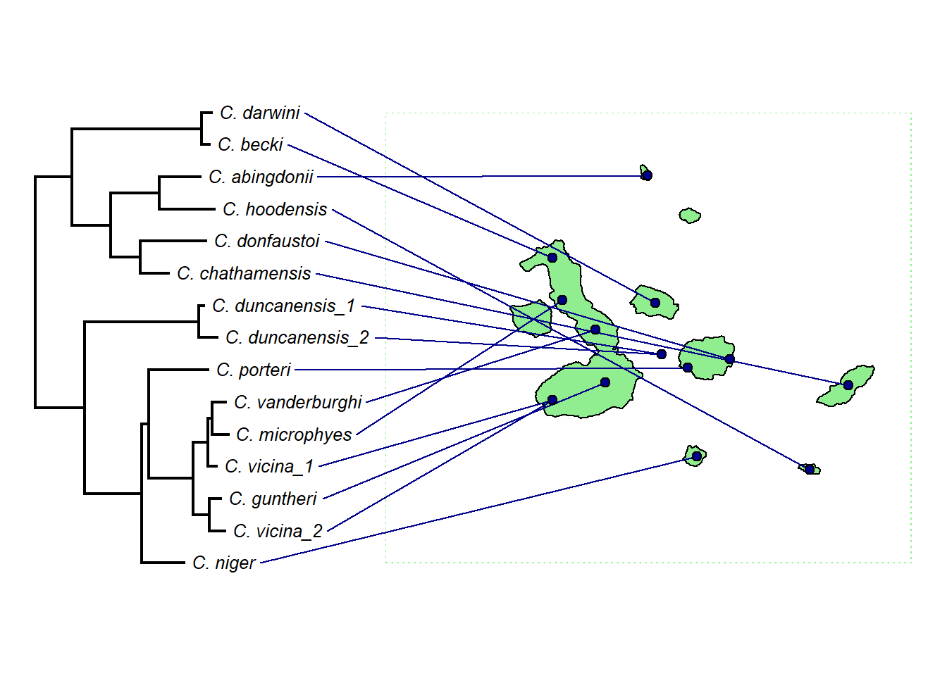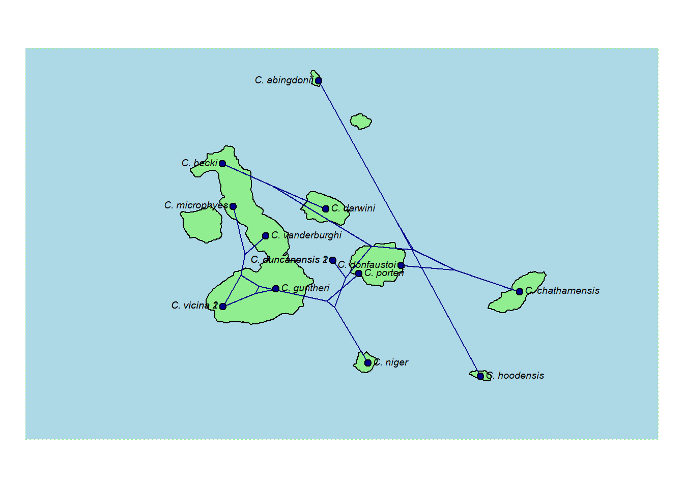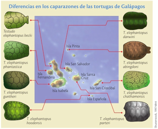 Radiación evolutiva de las tortugas de Galápagos, a consecuencia de la especiación alopátrica. Cada isla alberga una subespecie distinta.