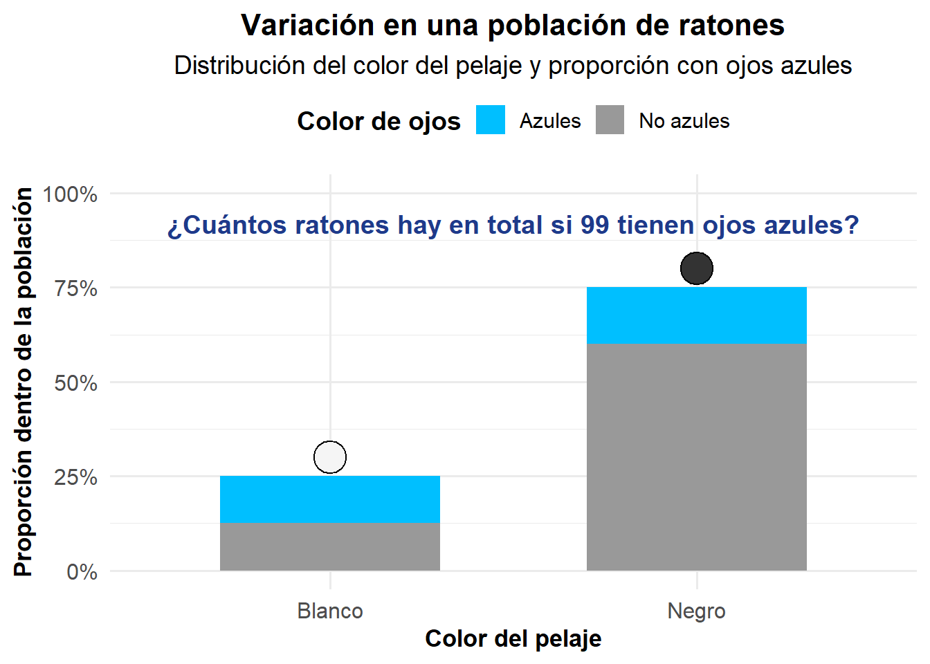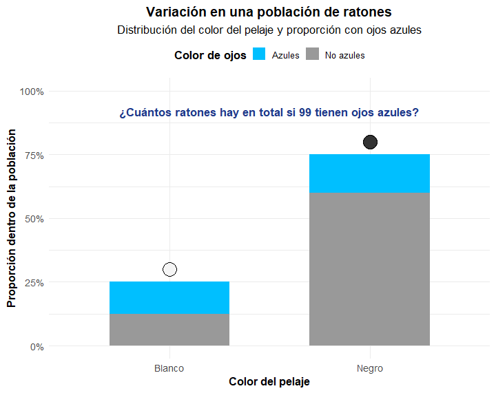 library(ggplot2)# ----------------------------------------------------------# Datos# ----------------------------------------------------------ratones<-data.frame( color_pelaje =rep(c("Blanco", "Negro"), each =2), ojos =rep(c("Azules", "No azules"), 2), porcentaje =c(0.25*0.5, 0.25*0.5, 0.75*0.2, 0.75*0.8))# Colorescolores_pelaje<-c("Blanco"="#F5F5F5", "Negro"="#333333")colores_ojos<-c("Azules"="#00BFFF", "No azules"="#999999")# Calcular altura total de cada barratotal_barra<-aggregate(porcentaje~color_pelaje, data =ratones, sum)# ----------------------------------------------------------# Gráfico con símbolo sobre cada barra y títulos centrados# ----------------------------------------------------------ggplot()+# Sub-barras por color de ojosgeom_bar(data =ratones,aes(x =color_pelaje, y =porcentaje, fill =ojos), stat ="identity", width =0.6, colour =NA)+# Símbolo representando el color del pelajegeom_point(data =total_barra,aes(x =color_pelaje, y =porcentaje+0.05, fill =color_pelaje), shape =21, size =8, colour ="black")+scale_fill_manual(values =c(colores_ojos, colores_pelaje), breaks =names(colores_ojos), name ="Color de ojos")+scale_y_continuous(labels =scales::percent_format(accuracy =1), limits =c(0, 1))+theme_minimal(base_size =14)+theme( panel.background =element_rect(fill ="white", color =NA), plot.background =element_rect(fill ="white", color =NA), axis.title =element_text(size =13, face ="bold"), axis.text =element_text(size =12), legend.position ="top", legend.title =element_text(face ="bold"), plot.title =element_text(hjust =0.5, face ="bold", size =16), plot.subtitle =element_text(hjust =0.5, size =14))+labs( title ="Variación en una población de ratones", subtitle ="Distribución del color del pelaje y proporción con ojos azules", x ="Color del pelaje", y ="Proporción dentro de la población")+annotate("text", x =1.5, y =0.92, label ="¿Cuántos ratones hay en total si 99 tienen ojos azules?", color ="#1E3A8A", fontface ="bold", size =5)