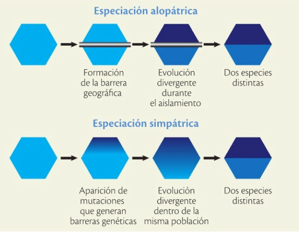 En esta imagen se muestra una representación esquemática de los procesos de especiación alopátrica y simpátrica. En la especiación alopátrica, una barrera geográfica divide la población, lo que conduce a la divergencia genética y a la formación de nuevas especies. En la especiación simpátrica, la diferenciación ocurre dentro de la misma área geográfica, impulsada por mutaciones y selección divergente sin separación física.