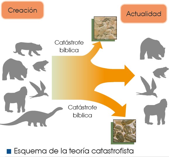 Según la teoría catastrofista, hubo extinciones de algunas especies que coincidieron con las catástrofes descritas en la Biblia. Estas catástrofes explicarían la existencia de fósiles de especies que ya no existen.