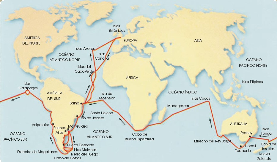 El 27 de diciembre de 1831, el Beagle zarpó de Plymouth (Inglaterra) y no regresó hasta casi cinco años después, el 2 de octubre de 1836. El barco inició su travesía hacia Sudamérica, y recorrió gran parte de su costa, desde Bahía (Brasil) hasta las islas Galápagos (Ecuador) pasando por las costas de Uruguay, Argentina, Chile y Perú. La etapa americana del viaje duró cerca de cuatro años, después de los cuales, el Beagle se dirigió a Australia y Nueva Zelanda. Desde allí el viaje continuó por el sur de África hasta, finalmente, volver a Inglaterra.