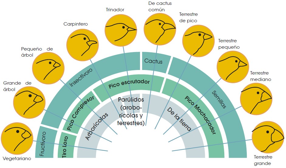 Después de numerosos estudios, se ha demostrado que la estructura del pico de los pinzones está directamente relacionada con la alimentación de cada uno de ellos y, por tanto, con los alimentos disponibles en cada isla del archipiélago de Galápagos.