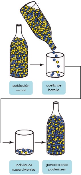 El efecto cuello de botella es otro fenómeno que puede fomentar la existencia de deriva génica. Este efecto consiste en la disminución drástica de una población por efectos distintos a la selección natural. Al quedar un bajo número de individuos, cualquier característica rara que presenten los supervivientes se expresará mucho en las siguientes generaciones; e igualmente se disminuye la diversidad.