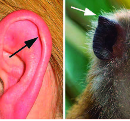Un ejemplo de órgano vestigial es el tubérculo de Darwin en humanos, reminiscencia de la punta de la oreja que presentaría alguno de nuestros antepasados. En nuestros antepasados dicha punta sería parecida a la de los simios actuales.