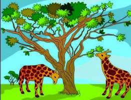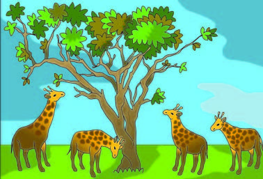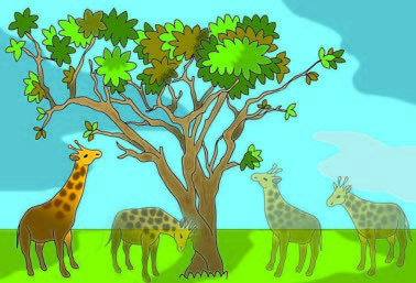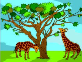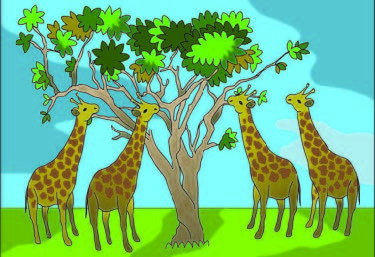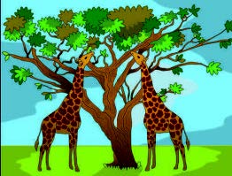 | Los antecesores de las jirafas actuales serían unos animales de cuello corto parecidos a los okapis actuales. | Cuando escasea el alimento, los individuos se esfuerzan para llegar a las capas de follaje más altas. De esta manera se les alarga el cuello. | El carácter «cuello largo» pasa a los descendientes que, a su vez, alargarán más el cuello, y así sucesivamente hasta las jirafas actuales. |
