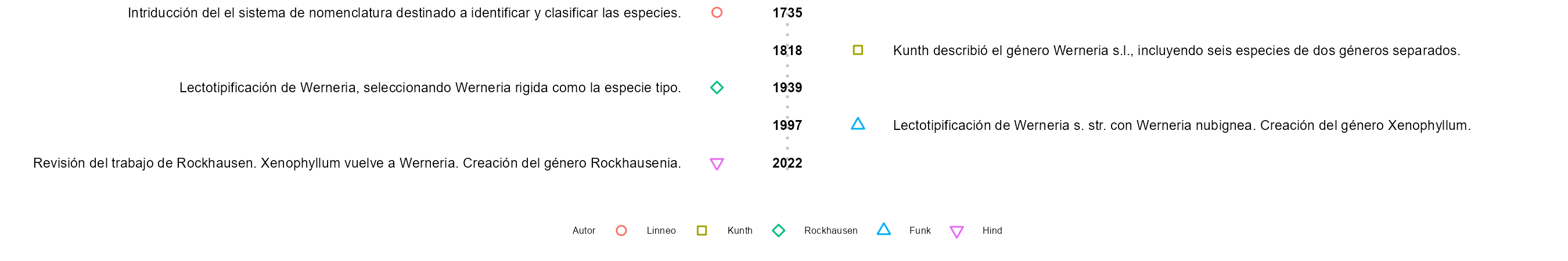 Pero, en un estudio en 2022 se descubrió que antes de la revisión de Funk en 1997, Rockhausen ya había lectotipificado Werneria en 1939, seleccionando Werneria rigida como la especie tipo. Esta publicación probablemente no fue revisada al cambiar la ubicación del tipo, de Werneria rigida, a Xenophyllum rigidum, creando un sinónimo genérico innecesario. En consecuencia, para términos nomenclaturales, todas las especies que Funk reconoció y clasificó dentro de Xenophyllum deberían considerarse, en realidad, como pertenecientes al género Werneria.