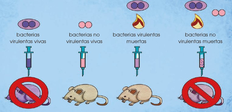 Uno de los experimentos más destacados en este punto fue el de Frederick Griffith (Avery, O.; McLeod, C. & McCarty, M. 1944. Studies on the Chemical Nature of the Substance Inducing Transformation of Pneumococcal Types: Induction of Transformation by a Desoxyribonucleic Acid Fraction Isolated from Pneumococcus Type III. Journal of Experimental Medicine. 79: 137-158) quien inyectó diferentes cepas de bacterias en ratones. La cepa S era dañina y mataba al ratón mientras que la cepa R no era virulenta y no mataba al ratón. Griffith comprobó que al calentar la cepa S, esta dejaba de ser dañina y no mataba al ratón. Sin embargo, al mezclar la cepa S calentada (no dañina) con la cepa R (no dañina) el ratón sí moría. Griffith comprobó que esto ocurría porque había una transferencia del ADN de las bacterias de la cepa S a la R.