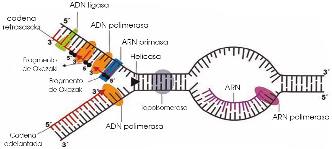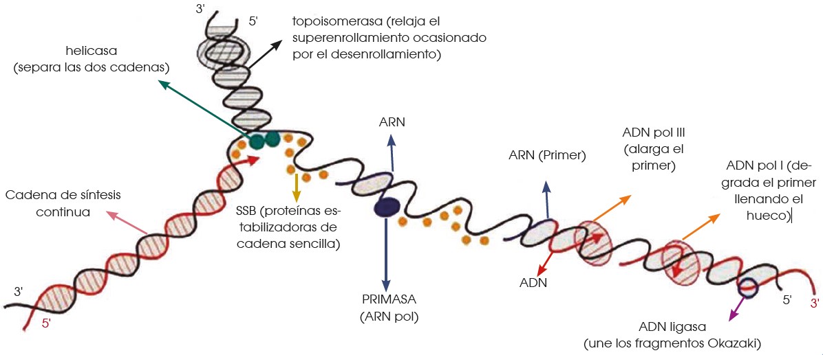 A partir del origen de replicación, se formará una horquilla de replicación en la que el ADN modifica su estructura espacial. En la formación de la horquilla intervienen:
