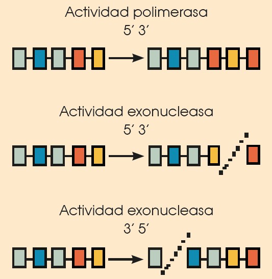 —Tienen actividad exonucleasa; es decir, catalizan la rotura de los enlaces entre los nucleótidos cuando las moléculas tienen un extremo libre.