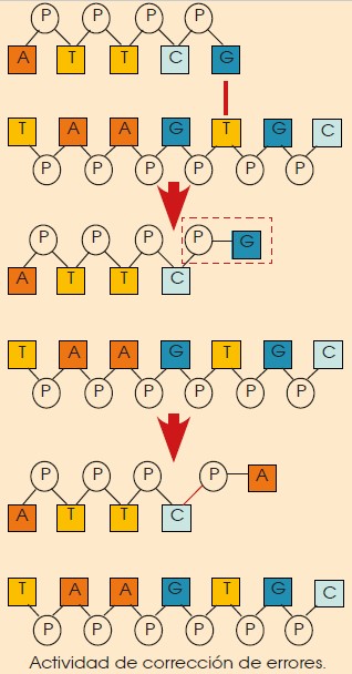 En caso de que se produzca un emparejamiento erróneo, la ADN pol I detiene la síntesis y, con su actividad exonucleásica 3’ 5’, corta el enlace del nucleótido erróneo a la cadena y coloca el nucleótido adecuado.
