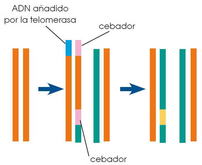 El ADN de las células eucariotas no está cerrado sobre sí mismo, como el de las células procariotas, sino que es lineal. Tal y como hemos indicado en el apartado anterior, al eliminar los ARN cebadores de los extremos de las cadenas quedaría una cadena incompleta. La enzima telomerasa alarga los extremos de los cromosomas para evitar la pérdida de material genético durante la replicación.