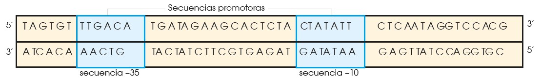 La secuencia de nucleótidos de los promotores depende de cada organismo, pero en Escherichia coli se han observado coincidencias importantes: en general, la secuencia –35 corresponde a una combinación de nucleótidos similar a TTGACA, y la secuencia –10 se corresponde habitualmente con la secuencia TATATT.