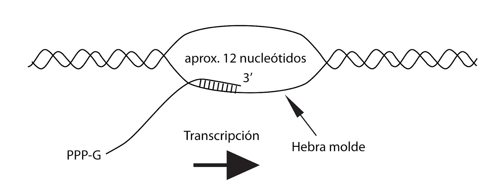La síntesis progresa en sentido 5’ 3’ y el ARN se mantiene unido al ADN en un pequeño fragmento de unos veinte a treinta nucleótidos a partir del extremo en crecimiento.