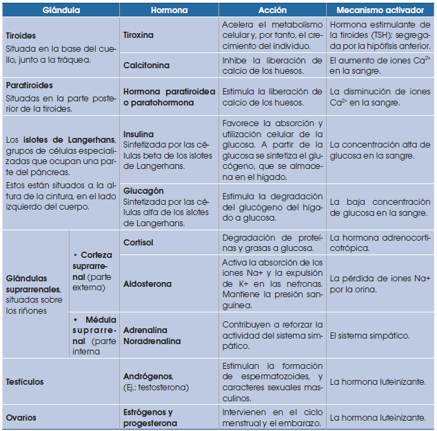 A continuación, resumimos las principales glándulas endocrinas, las hormonas que sintetizan y el mecanismo que activa su secreción.
