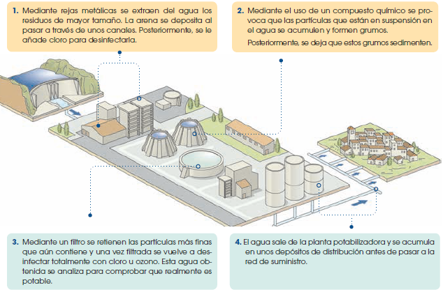 Este proceso, que veremos a continuación, se lleva a cabo en una planta potabilizadora, una instalación donde entra el agua procedente de un río, embalse y acuífero, y es sometida a un tratamiento fisicoquímico que permite su transformación en agua potable.