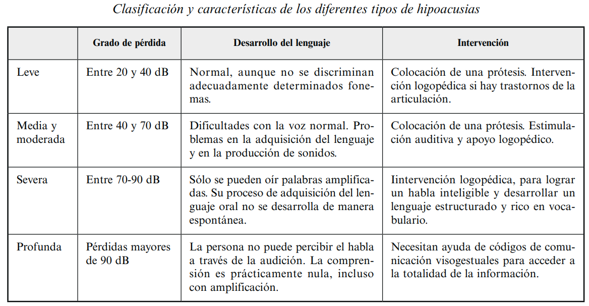 Discapacidad auditiva: El déficit auditivo es un término genérico que engloba los diversos grados de la pérdida auditiva. Se produce pérdida auditiva cuando hay una interrupción en el camino que ha de seguir la señal sonora en el órgano de la audición, causando una disminución de la captación de los estímulos sonoros del entorno (Cardona, Gomar, Palmés y Sadurní, 2010).