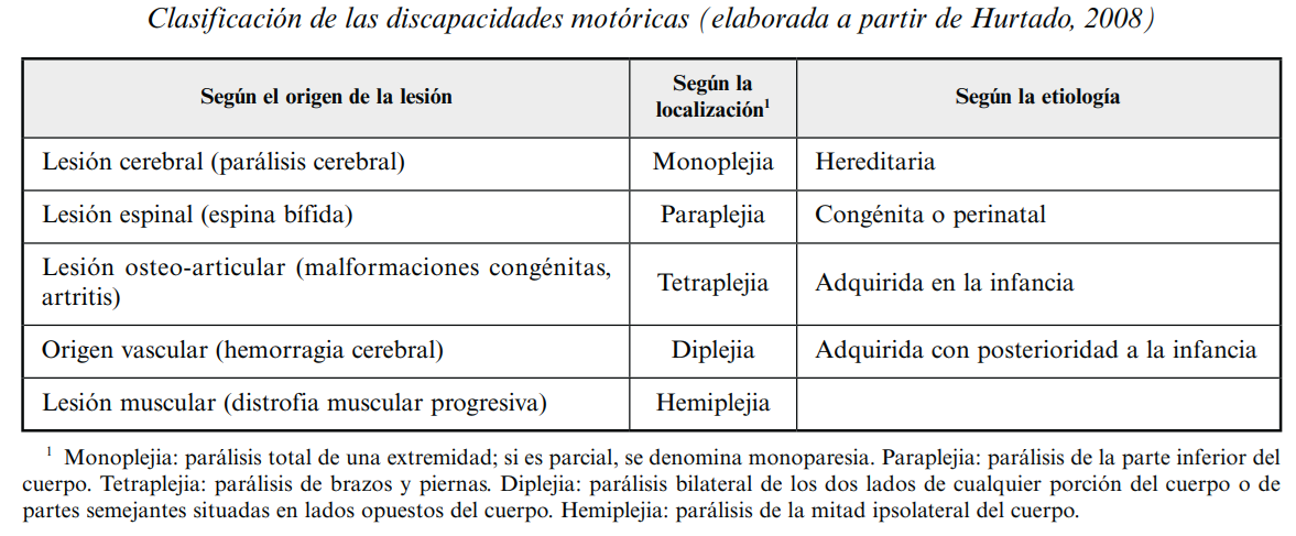 Discapacidad Física/Motora: Las discapacidades motóricas forman parte de las discapacidades físicas que dificultan en mayor o menor medida las posibilidades de movimiento de quienes las sufren. Su etiología es muy amplia, al igual que el grado de afectación a nivel motriz, lingüístico, psicológico y neurológico, por lo que las alteraciones del desarrollo y las NEE que estos niños presentan son también muy diferentes. (Fiuza, Et al, 2014).
