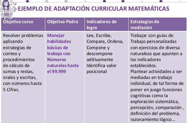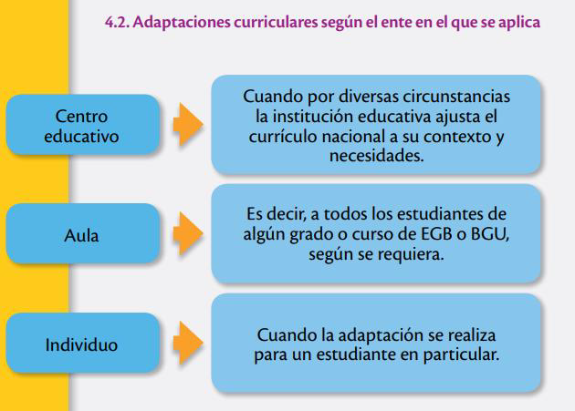 Son modificaciones que se realizan en los elementos del currículo, como los objetivos, destrezas, metodología, recursos, actividades, tiempo de realización de la tarea, evaluación, así como en las condiciones de acceso, con el fin de responder a las NEE de cada estudiante. (MINEDUC, 2019).