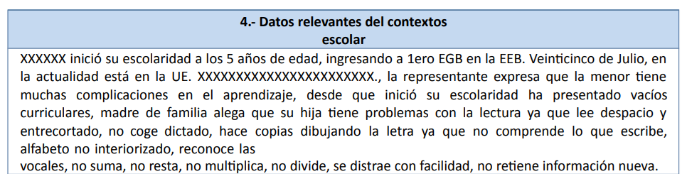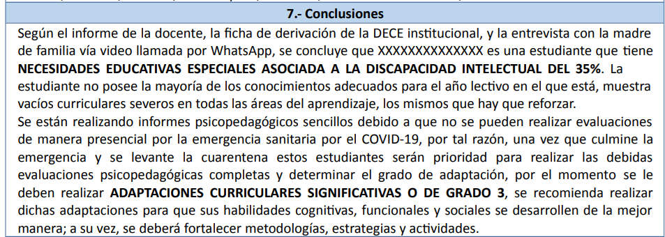 7.- Conclusiones Según el informe de la docente, la ficha de derivación de la DECE institucional, y la entrevista con la madre de familia vía video llamada por WhatsApp, se concluye que XXXXXXXXXXXXXX es una estudiante que tiene NECESIDADES EDUCATIVAS ESPECIALES ASOCIADA A LA DISCAPACIDAD INTELECTUAL DEL 35%. La estudiante no posee la mayoría de los conocimientos adecuados para el año lectivo en el que está, muestra vacíos curriculares severos en todas las áreas del aprendizaje, los mismos que hay que reforzar. Se están realizando informes psicopedagógicos sencillos debido a que no se pueden realizar evaluaciones de manera presencial por la emergencia sanitaria por el COVID-19, por tal razón, una vez que culmine la emergencia y se levante la cuarentena estos estudiantes serán prioridad para realizar las debidas evaluaciones psicopedagógicas completas y determinar el grado de adaptación, por el momento se le deben realizar ADAPTACIONES CURRICULARES SIGNIFICATIVAS O DE GRADO 3, se recomienda realizar dichas adaptaciones para que sus habilidades cognitivas, funcionales y sociales se desarrollen de la mejor manera; a su vez, se deberá fortalecer metodologías, estrategias y actividades.