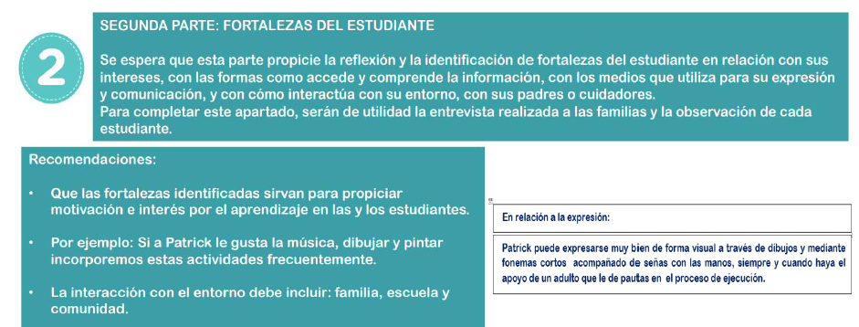 Se espera que esta parte propicie la reflexión y la identificación de fortalezas del estudiante en relación con sus intereses, con las formas como accede y comprende la información, con los medios que utiliza para su expresión y comunicación, y con cómo interactúa con su entorno, con sus padres o cuidadores. Para completar este apartado, serán de utilidad la entrevista realizada a las familias y la observación de cada estudiante.