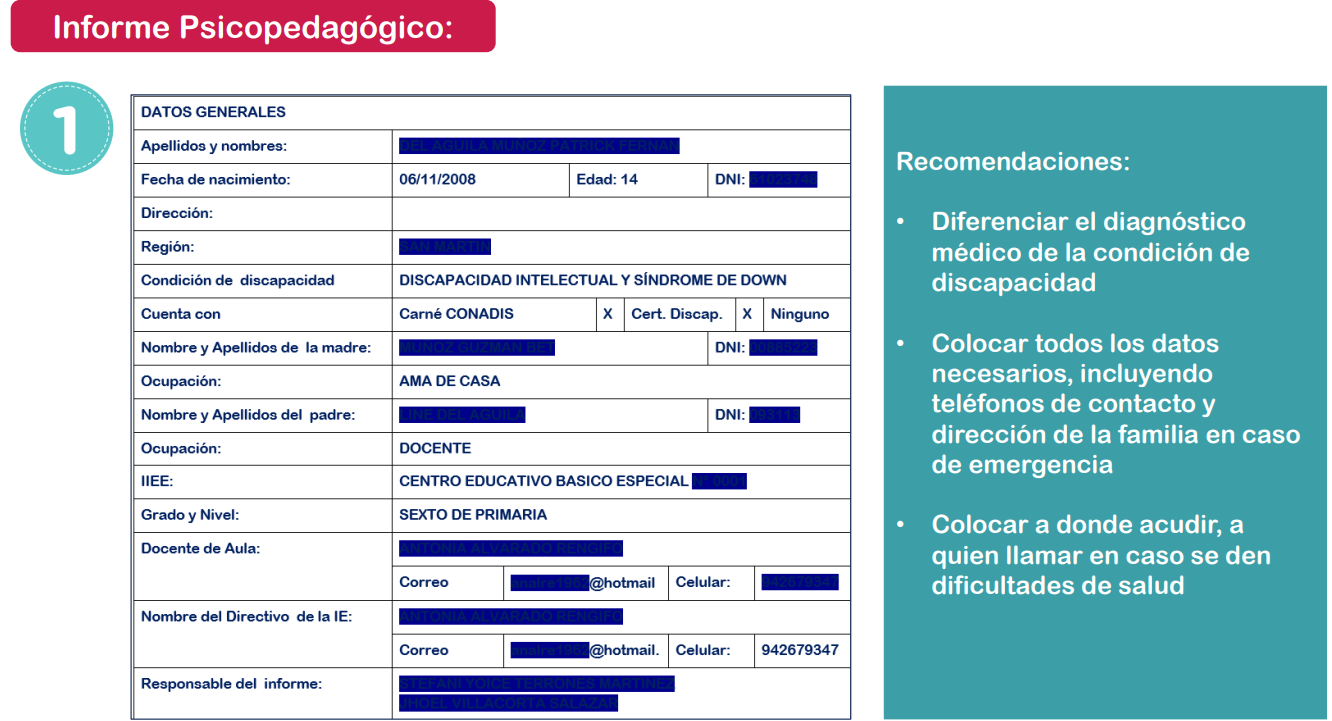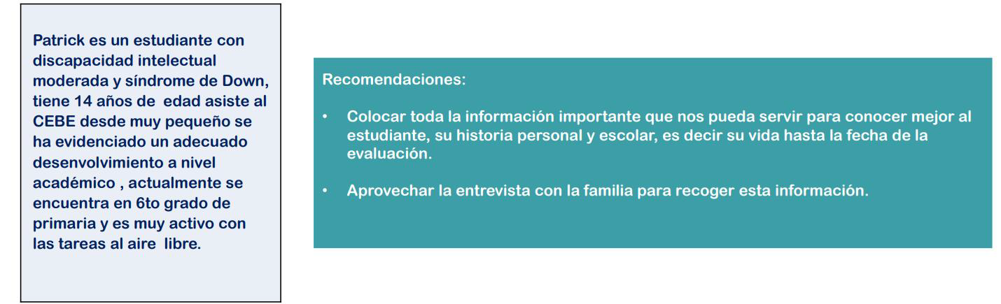 Implica los datos de filiación, conocimiento de aspectos necesarios para identificar al paciente o estudiante, posee o no discapacidad, institución, fecha de evaluación (indica la fecha en la que empieza la evaluación, considerando que puede tomar más de un día) (Mineduc, 2019)