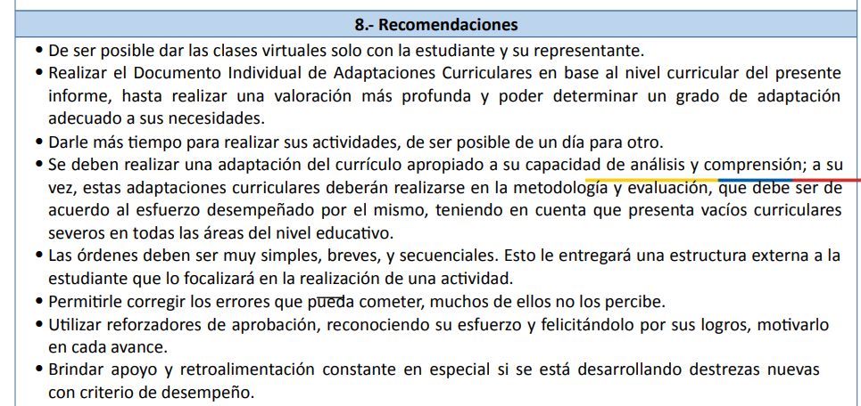 8.- Recomendaciones • De ser posible dar las clases virtuales solo con la estudiante y su representante. • Realizar el Documento Individual de Adaptaciones Curriculares en base al nivel curricular del presente informe, hasta realizar una valoración más profunda y poder determinar un grado de adaptación adecuado a sus necesidades. • Darle más tiempo para realizar sus actividades, de ser posible de un día para otro. • Se deben realizar una adaptación del currículo apropiado a su capacidad de análisis y comprensión; a su vez, estas adaptaciones curriculares deberán realizarse en la metodología y evaluación, que debe ser de acuerdo al esfuerzo desempeñado por el mismo, teniendo en cuenta que presenta vacíos curriculares severos en todas las áreas del nivel educativo. • Las órdenes deben ser muy simples, breves, y secuenciales. Esto le entregará una estructura externa a la estudiante que lo focalizará en la realización de una actividad. • Permitirle corregir los errores que pueda cometer, muchos de ellos no los percibe. • Utilizar reforzadores de aprobación, reconociendo su esfuerzo y felicitándolo por sus logros, motivarlo en cada avance. • Brindar apoyo y retroalimentación constante en especial si se está desarrollando destrezas nuevas con criterio de desempeño.