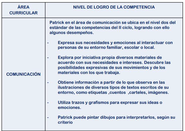 Patrick en el área de comunicación se ubica en el nivel dos del estándar de las competencias del II ciclo, logrando con ello algunos desempeños.