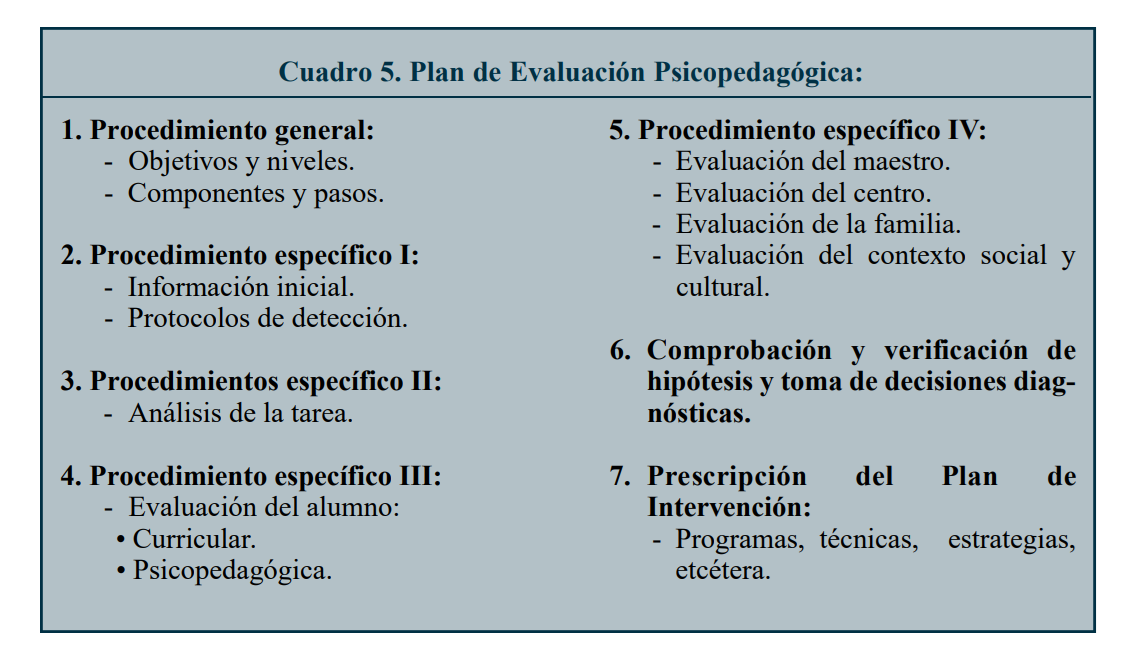 5. Procedimiento específico IV: Evaluación del maestro. Evaluación del centro. Evaluación de la familia. Evaluación del contexto social y cultural.