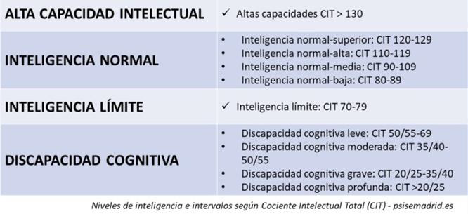 | INTELIGENCIA NORMAL | Inteligencia normal-superior: CIT 120-129 Inteligencia normal-alta: CIT 110-119 Inteligencia normal-media: CIT 90-109 Inteligencia normal-baja: CIT 80-89 |