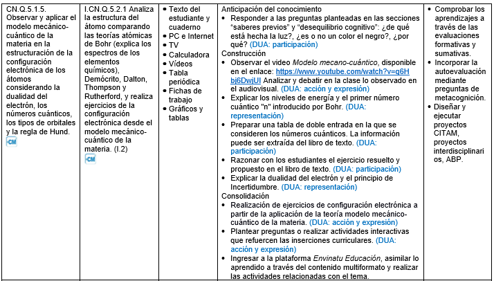 CN.Q.5.1.5. Observar y aplicar el modelo mecánico-cuántico de la materia en la estructuración de la configuración electrónica de los átomos considerando la dualidad del electrón, los números cuánticos, los tipos de orbitales y la regla de Hund.