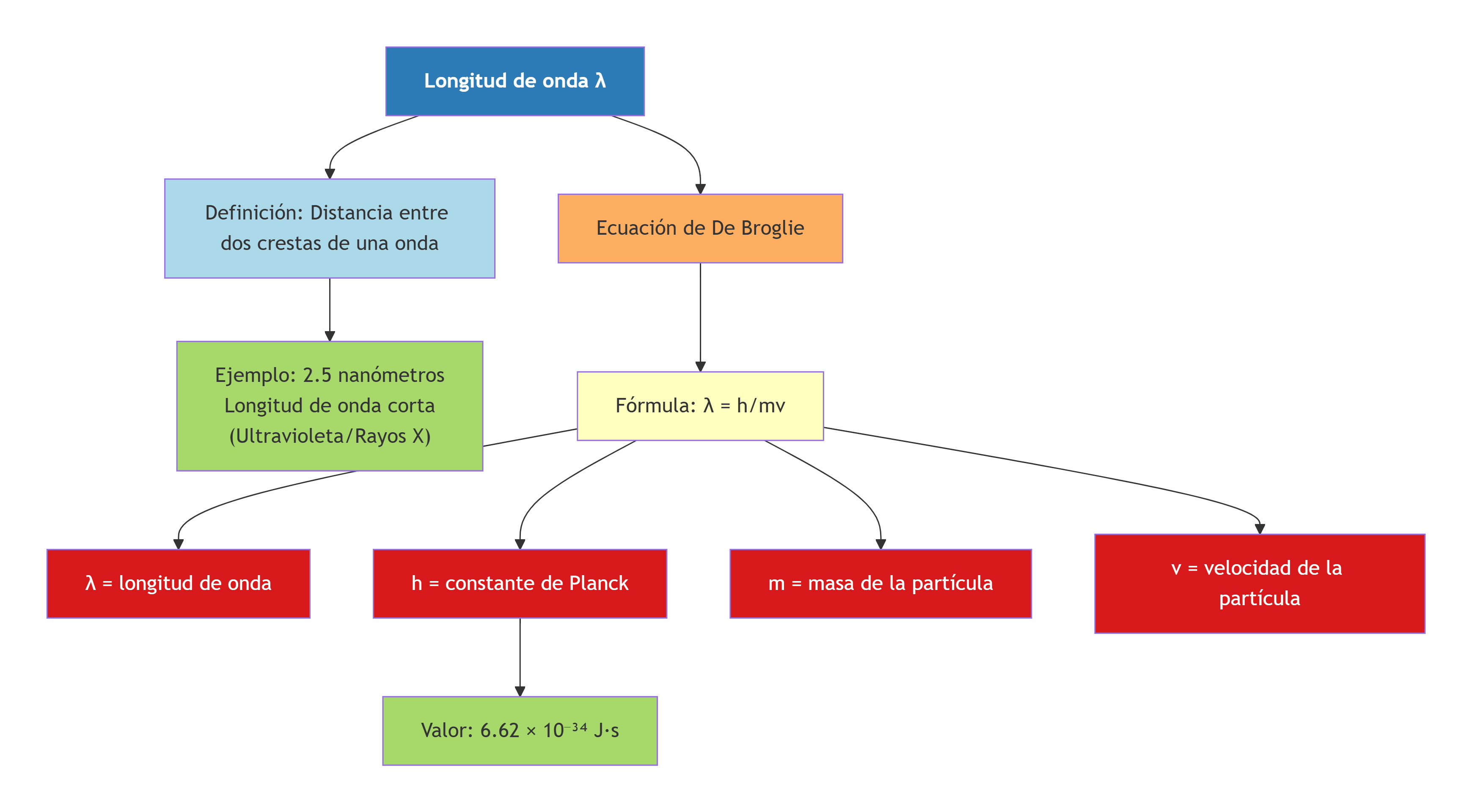 node2 --> node4[Ejemplo: 2.5 nanómetros<br/>Longitud de onda corta<br/>(Ultravioleta/Rayos X)]