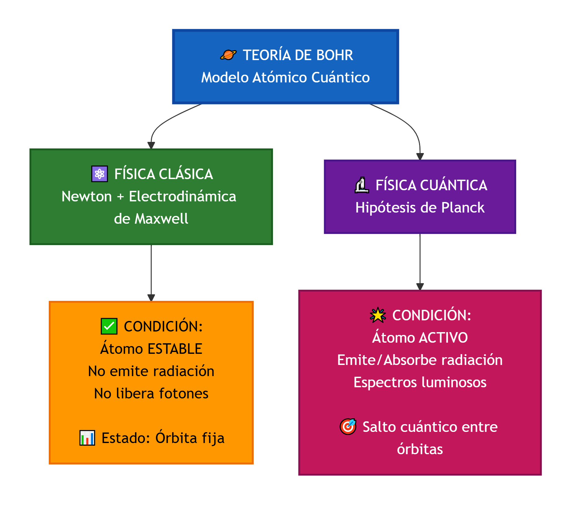A[🪐 TEORÍA DE BOHR<br/>Modelo Atómico Cuántico] --> B[⚛️ FÍSICA CLÁSICA<br/>Newton + Electrodinámica de Maxwell]